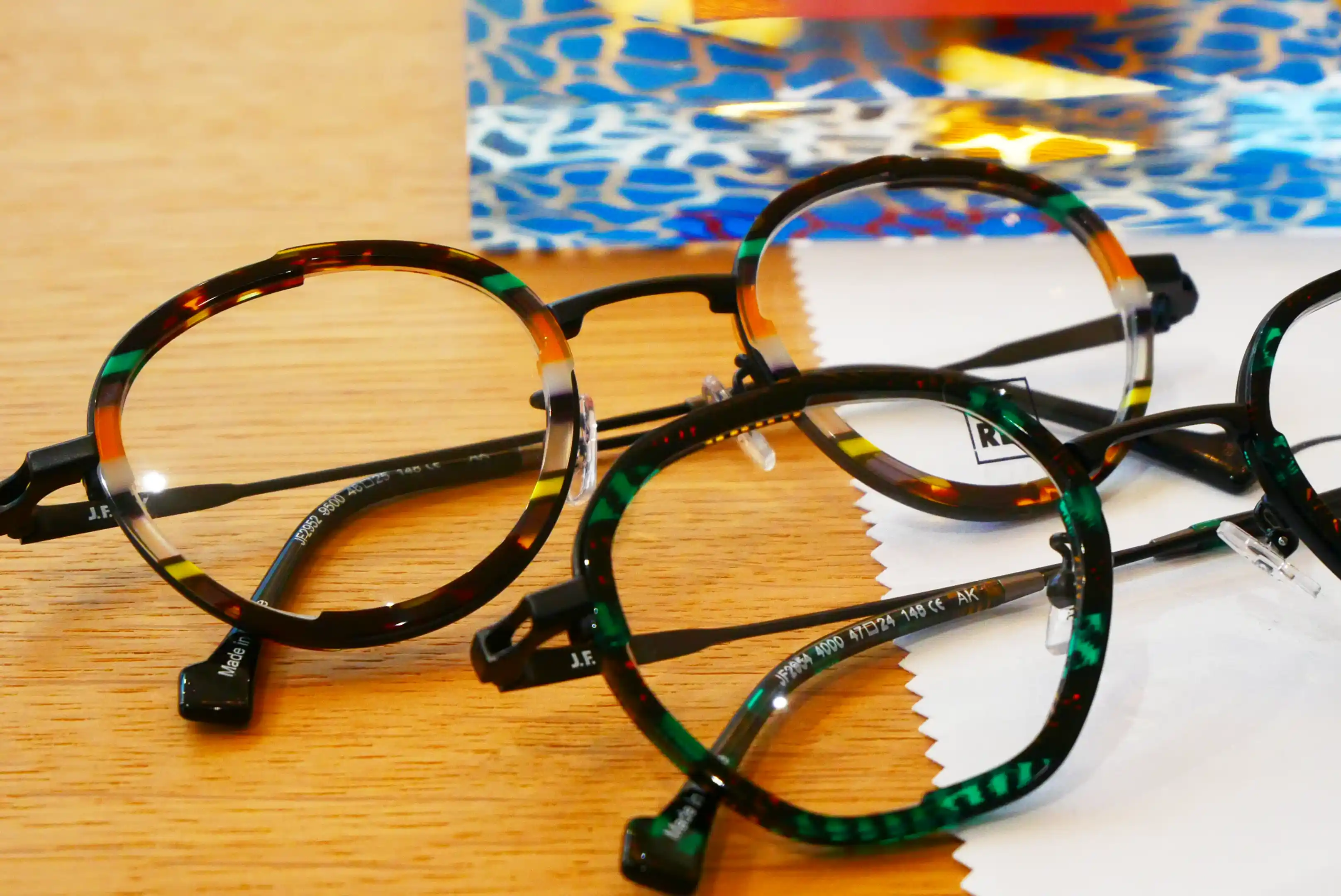 Des lunettes aux formes étonnantes, aux couleurs audacieuses, des pièces rares qui donnent de l’allure à ceux qui les portent et font de cet artisan un artiste.